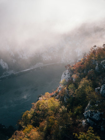 Explore a serene canyon enveloped in mist, featuring calm waters and rugged cliffs. This tranquil landscape invites adventure and reflection in nature.