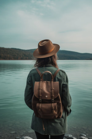 An AI generated illustration of a woman with a hat standing on the bank of the river
