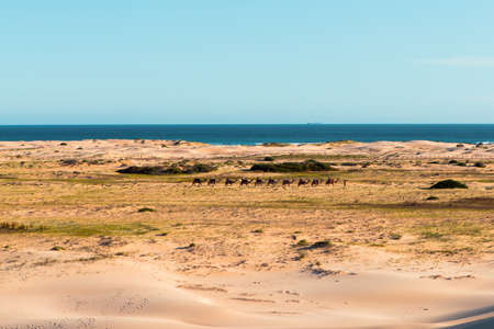 Sand dunes on the beach. California landscape, bright sunny day, clear blue sky background, panoramic view, copy space