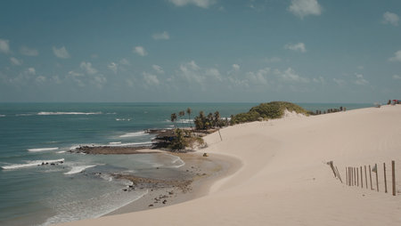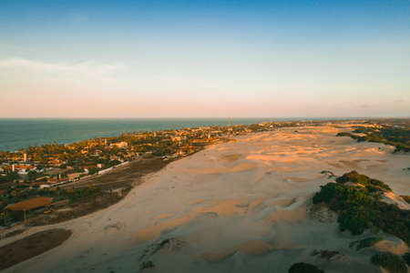 A high angle shot of a sandy hill by a village by the ocean under the blue sky in Northern Brazil