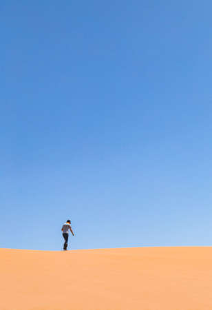 Single man on high dune in the Namib desert