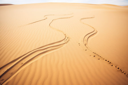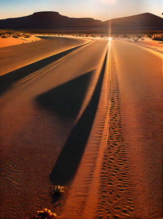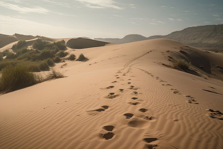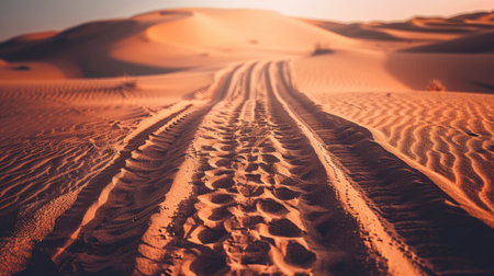 Footprints in the sand in the red desert at Sunrise.