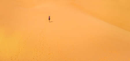 Tourist walking on the sand dunes at Sossusvlei, Namib desert, Namib Naukluft National Park, Namibia. Traveling people, adventure and vacations in Africa.