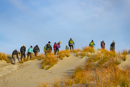 PILAT, FRANCE - FEBRUARY 22, 2022: group of tourists climbing in crowd the sandy slopes of the Pilat Dune (Dune du Pyla). Pilat, or Pyla Dune is the biggest sand dune in Europe, Arcachon Bay, Aquitaine.