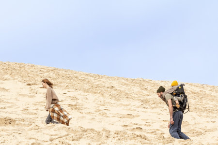 PILAT, FRANCE - FEBRUARY 22, 2022: Family of tourists, parents with children, climbing the Pilat Dune (Dune du Pyla). Pilat, or Pyla Dune is the biggest sand dune in Europe, in Arcachon Bay, in Aquitaine.