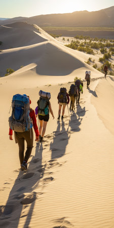 A group of people walking during sunset on dunes leaving footprints