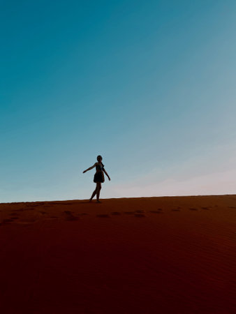Woman silhouette enjoy sand dunes in desert in sunset blue hour alone. Travel lifestyle and wellness concept. Cinematic wanderlust background