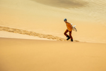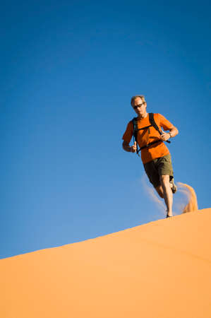 Male hiker running across Star Dune, Coral Pink Sand Dunes State Park, Utah, USA