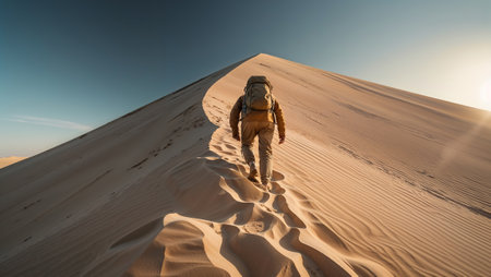 Backpacker people explore and adventure leisure activity concept with man walking on the desert dunes with backpack - alternative vacation for freedom lifestyle - scenic nature outdoor