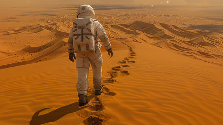 Man walking through desert, focus on footprint in sand