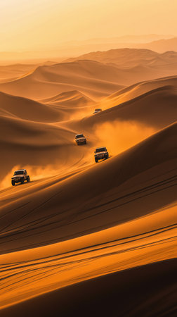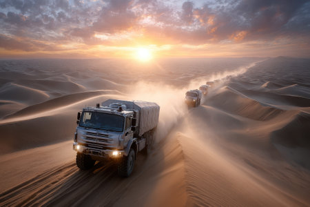 Multiple trucks traverse sandy dunes under a vibrant sunset sky, showcasing the vast desert terrain.