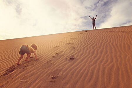 Kids brother and sister having fun running down famous red sand dune Big Daddy in Sossusvlei Namibia