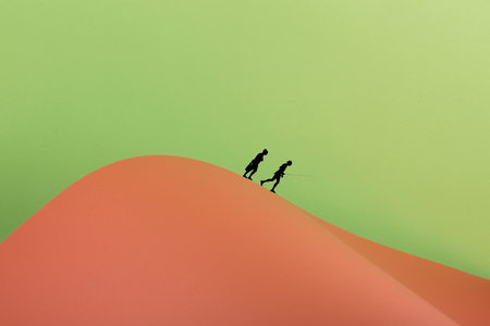 Two hikers climb on the sand dunes, Dunhuang, Gansu of China
