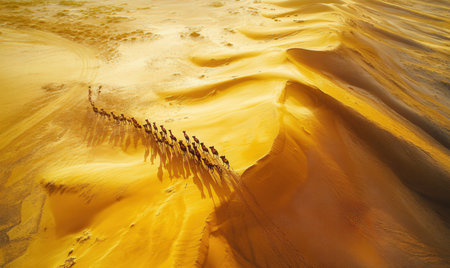 Group of camels walking in the orange sand dunes of Sossusvlei, Namib Naukluft National Park, Namibia