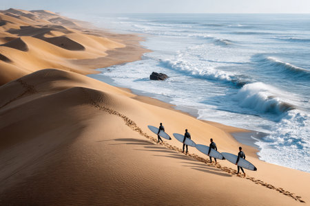 A group of surfers walk along golden sand dunes heading towards the crashing waves of the ocean at dawn.