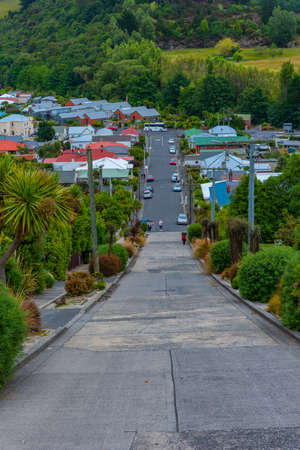 Panorama view of famous Baldwin Street steepest road in the world infrastructure construction record in Dunedin Otago South Island New Zealand