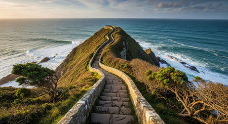 a trail winds its way towards a majestic cliff overlooking the ocean below. this soft and dreamy landscape, with its light cyan and gold hues, captures the essence of pastoral scenes. the beauty of this naturalist aesthetic, reminiscent of english countryside scenes, is truly breathtaking. ai generated