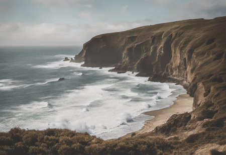 The rugged coastline is a symphony of crashing waves and jagged cliffs, where natures forces collide to create a breathtaking panorama of raw beauty.. AI generated.