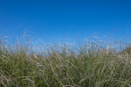 Beautiful beach dunes showcase lush grasses swaying gently in the wind under a brilliant blue sky. Perfect for capturing nature's peaceful and serene beauty.