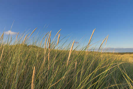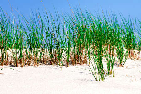 Grass and white sand dunes on the beach on a hot summer afternoon.