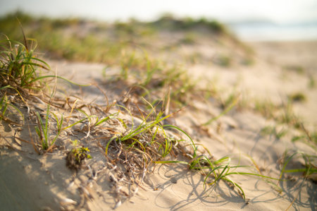 Beach grass growing on a sand dune, receiving warm golden light from a distant sunset over a calm ocean, evoking feelings of peace, serenity, and natural beauty along the coast