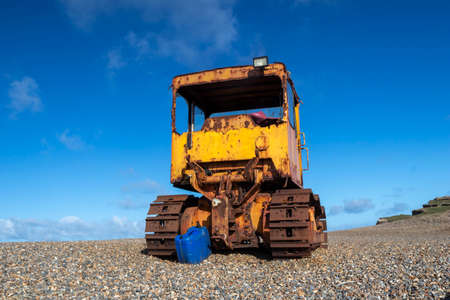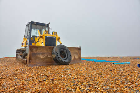 Hastings, England - December 30, 2016: Bulldozer on the stony beach in Hastings, East sussex, England