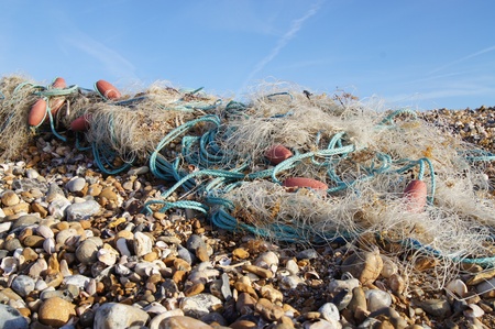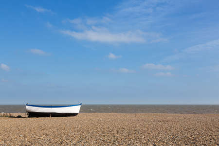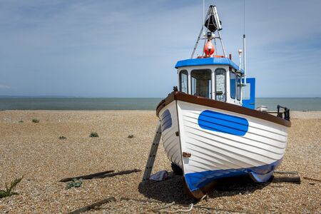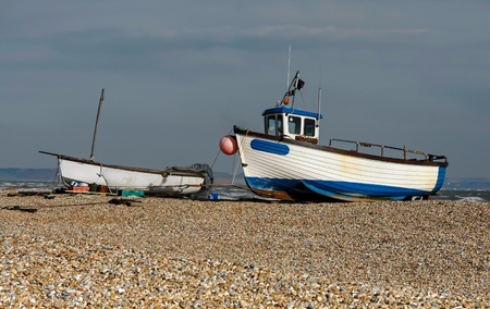 A fishing boat on Dungeness beach, a headland on the coast of Kent, England, formed largely of a shingle beach.