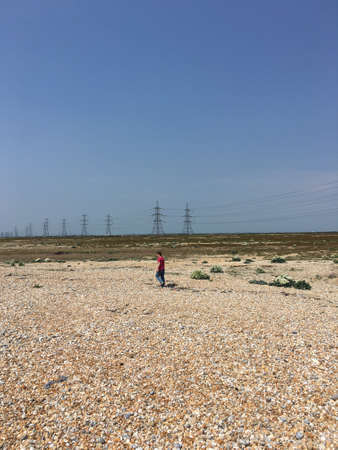The pebble beach at Dungeness with the new lighthouse in the distance