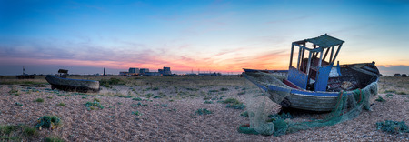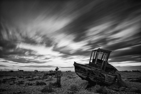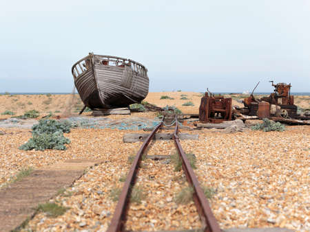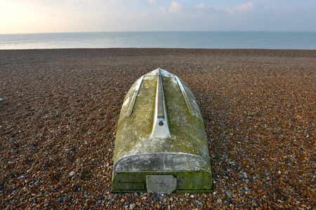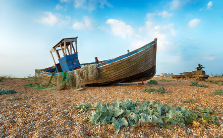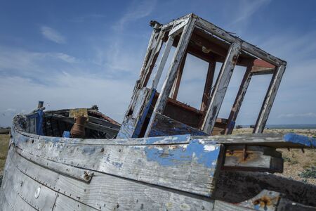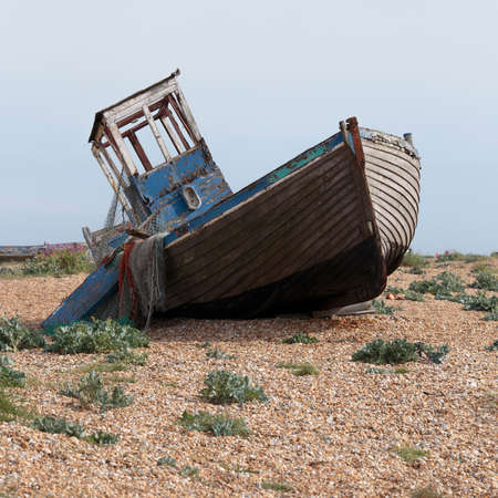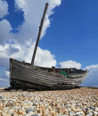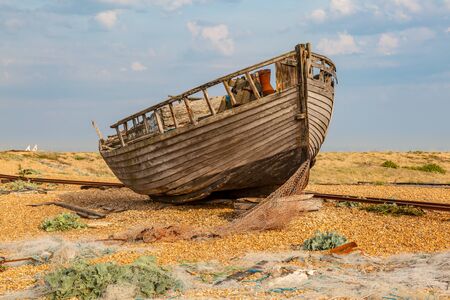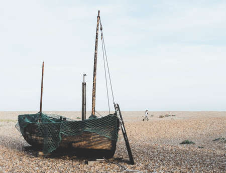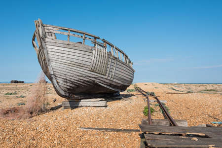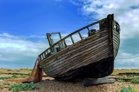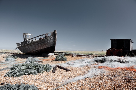 An abandoned fishing boat on Dungeness beach, a headland on the coast of Kent, England, formed largely of a shingle beach.