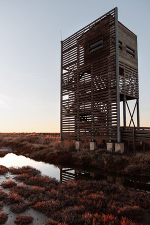View from Bird observatory at National Park of Evros Delta, near Alexandroupolis and Turkish border, Dadia forest and protected wetland, sunset or sunrise.
