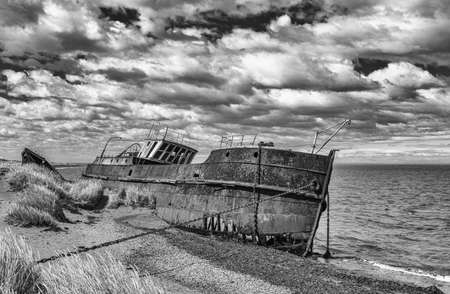 Wreck of Amadeo steamship build in 19th century in United Kingdom is since 1932 beached near Estancia San Gregorio, Chile. Black and white