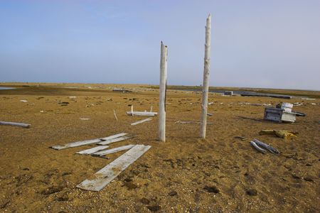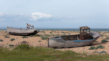 Two abandoned fishing boats on Dungeness beach, a headland on the coast of Kent, England, formed largely of a shingle beach.