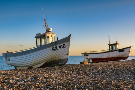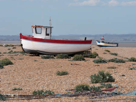 Two fishing boats on Dungeness beach, a headland on the coast of Kent, England, formed largely of a shingle beach.