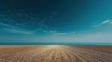 Expansive pebble beach meeting a calm blue ocean under a clear sky. Peaceful and vast.