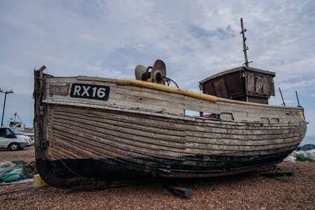 Hastings Port, East Sussex / UK - 2020.08.08: Hastings fishing boats on the beach at Rock-a-Nore