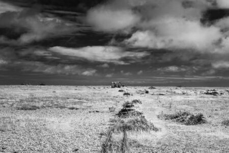 Abandoned fishing boat on shingle beach landscape at sunset black and white