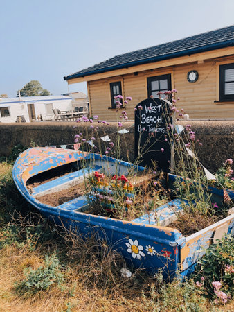 An old wooden fishing boat on a beach in Kent with clumps of Sea Cabbage growing in shingle