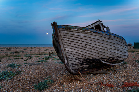 An old wrecked wooden fishing boat on a shingle beach under the light of a full moon