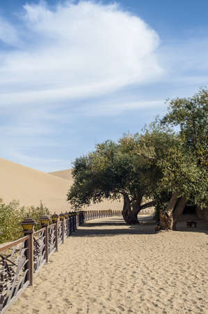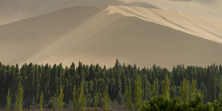 Trees with sand dunes at Mingsha Shan, Dunhuang, Jiuquan, Gansu Province, China