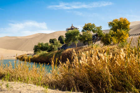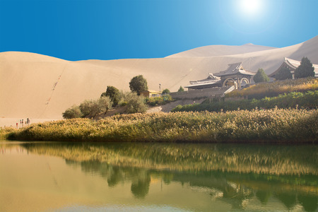 Oasis in desert atMingsha Shan, Dunhuang, Gansu Province, China.