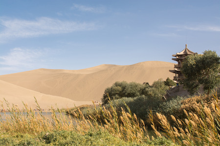 DUNHUANG,CHINA-MARCH 11: Mingyue Pavilion in Crescent lake, a part of silk road on March 11, 2016 in Dunhuang, China.