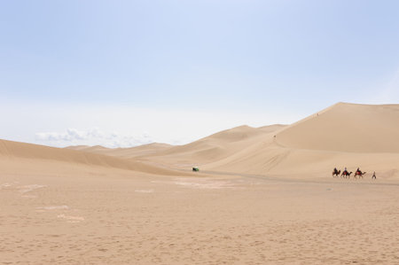 Dunhuang, China - June 29, 2012: Camels safari on the silk road at Mingsha sand dunes outside Dunhuang in the Gobi desert.