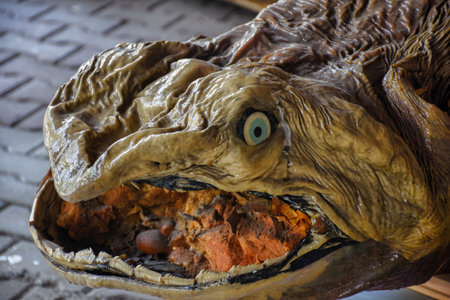 close up of the scary mouth of a dried and stuffed dangerous fish