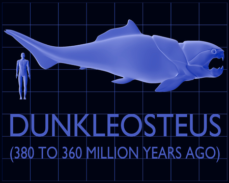 An illustration comparing an average height human with the enormous prehistoric predator fish known as Dunkleosteus of the Late Devonian Period (380 to 360 million years ago).