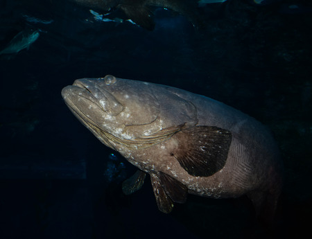 Large fish Giant grouper swimming in aquarium. Epinephelus lanceolatus, common brindlebass, brown spotted cod, or bumblebee grouper
