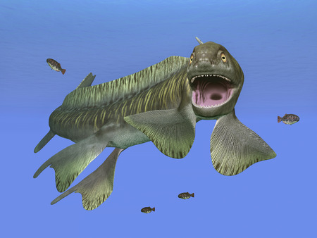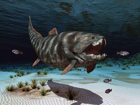 Dunkleosteus Fish eats Sea Perch - Dunkleosteus fish lived as a predator in Devonian Seas of North America, Europe and Morocco.