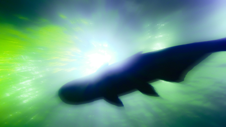 A mesmerizing sight of a gray fish swimming in the clear ocean water, illuminated by soft light. A perfect depiction of underwater tranquility.