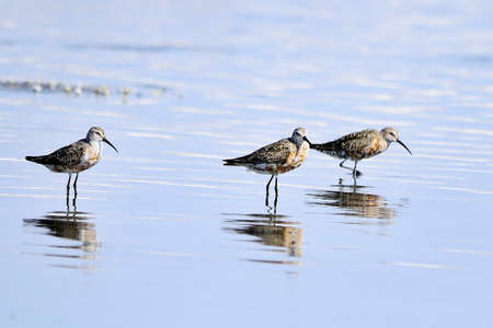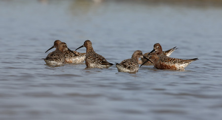 Curlew sandpiper, Calidris ferruginea, group of birds in water, Romania, May 2015