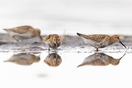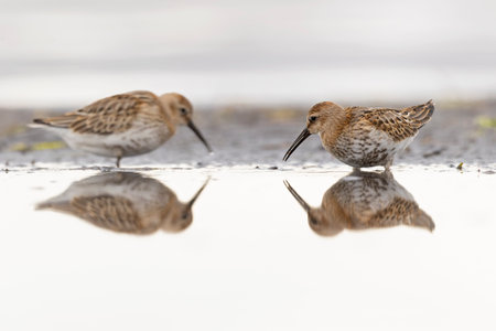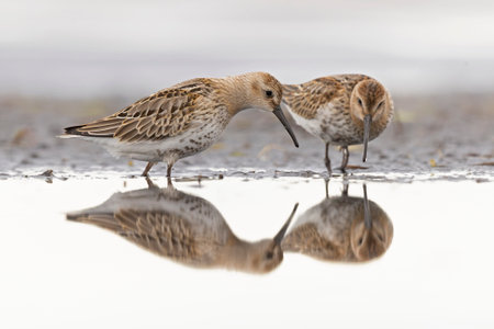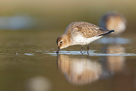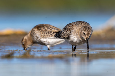 Two feeding Dunlin. The photo shows the defining signs of the Dunlin. Well blurred background. Morning soft light. Filmed on Tiligul estuary during migration