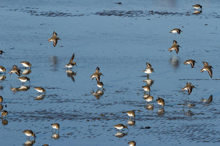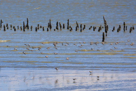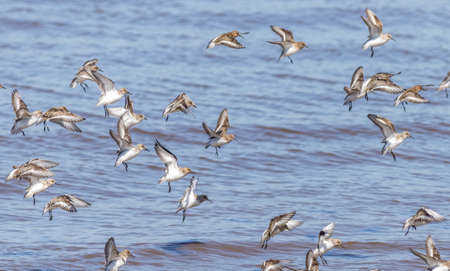 A flock of birds on the seashore. Sanderling, Calidris alba.